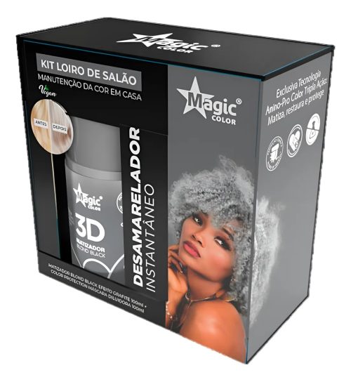 Kit Magic Color Loiro de Salão Blond Black – Efeito Grafite Kit composto por 1 Mini Matizador Blond Black efeito Grafite 100ml + 1 Máscara Diluidora 3D Color Protection 100ml A Magic Color, referência em matizadores, acredita que cabelo e cores são únicos. Portanto, desenvolvemos matizadores para a manutenção personalizada que enaltece o melhor de cada cabelo. Os Matizadores 3D contêm exclusiva tecnologia AMINO-PRO COLOR com sistema TRIPLA AÇÃO: matiza, restaura e protege. Com pigmentos de alta performance, neutraliza o amarelado e alaranjado dos fios, esfriando os tons quentes, repõe aminoácidos e proteínas reforçando sua estrutura, repara o fio danificado e quebradiço. ATENÇÃO: o resultado da neutralização varia de acordo com o clareamento do fio, preparo do produto e tempo de pausa. REALIZE TESTE DE MECHA antes da aplicação. Este produto não tem função de clarear os fios. Máscara Diluidora 3D Color Protection: o produto ideal para diluir os seus matizadores favoritos. Com a máscara especial para diluição, obtenha total controle sobre a intensidade da matização, maior rendimento do seu produto, alto poder condicionante e regenerador dos fios. Com Nano Ácido Hialurônico e Bioativos funcionais, possui nanomoléculas liberadas de forma gradual, repõe a massa capilar de forma inteligente, do córtex à cutícula, protegendo a cor por mais tempo. Atua como protetor térmico e filtro UV vegetal*. MODO DE USO: Misture a proporção de 1:2, ou seja, 1 medida do Matizador 3D Magic Color para 2 medidas da Máscara Diluidora 3D Color Protection. Deixe agir entre 3 e 10 minutos. Enxágue! Para fios loiros muito amarelados/alaranjados, recomendamos o tempo de pausa de 10 minutos. Para fios muito claros ou danificados, aumentar a diluição do produto. Precauções: uso adulto externo. Evite contato com os olhos. Em caso de irritação, suspenda o uso. Evite calor excessivo e mantenha fora do alcance de crianças e animais domésticos.